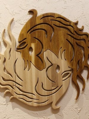 Sculpture sur le thème du signe astrologique chinois du cheval, revisité sous la forme d’un yin yang. L’un des chevaux est huilé ciré, l’autre est laissé nature.